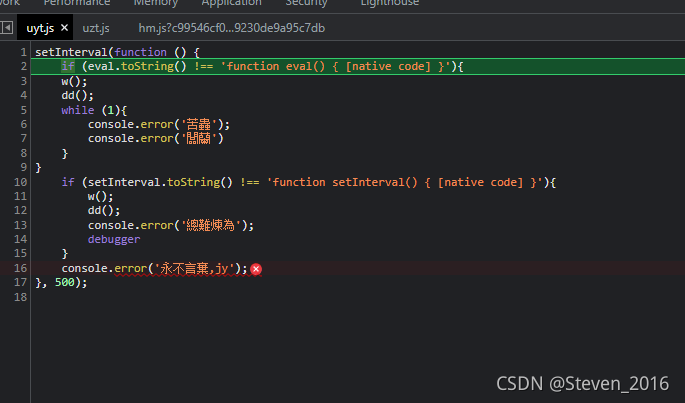 2、在这个JS里面也有一个计时器,并且 判断了setInterval.toString() 和 eval.toString() 的字符串是否一致;这个才是检测反调试的判断检测口;