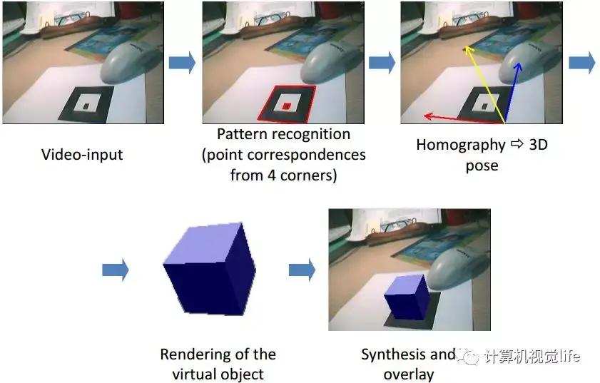 平面二维标记图案(marker)经常用来做AR展示。根据marker不同视角下的图像可以方便的得到虚拟物体的位置姿态并进行显示,如下图所示。