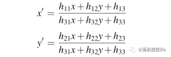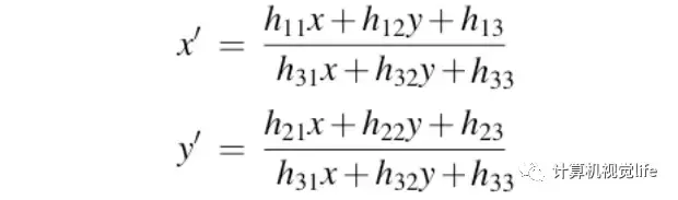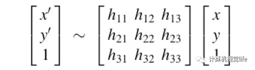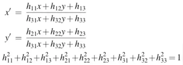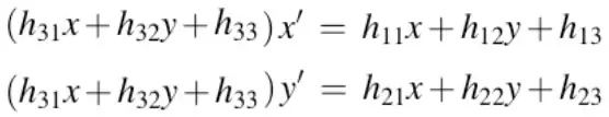 了解了上述单应性的部分应用后,我们就有很大的动力来学习单应矩阵的推导和计算了。首先,我们假设两张图像中的对应点对齐次坐标为(x\',y\',1)和(x,y,1),单应矩阵H定义为: