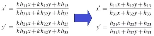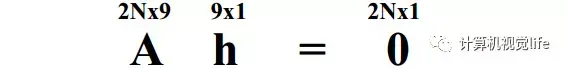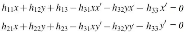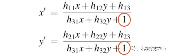 或许有人会说,9个啊,H矩阵不是9个参数吗?从h11到h33总共9个。真的是这样吗?实际上并不是,因为这里使用的是齐次坐标系,也就是说可以进行任意尺度的缩放。比如我们把hij乘以任意一个非零常数k并不改变等式结果:
