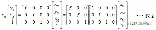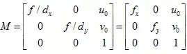 若暂不考虑透镜畸变,则将式2与式5的转换矩阵相乘即为内参矩阵M: