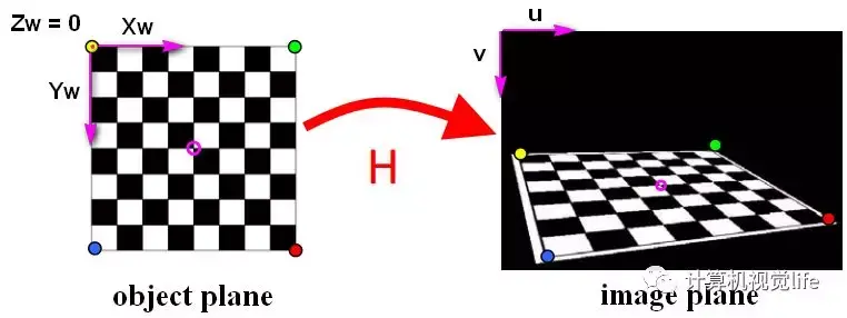 前面文章《从零开始学习「张氏相机标定法」(一)成像几何模型》中我们学习了相机成像几何模型,知道了如何将世界坐标系中的三维坐标和像素坐标系中的二维坐标联系起来,根据《从零开始学习「张氏相机标定法」(二)单应矩阵》,我们根据标定棋盘图纸及其对应的照片已经可以得到单应矩阵H了。如下所示: