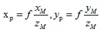 此时,假设相机坐标系中有一点M,则在理想图像坐标系下(无畸变)的成像点P的坐标为(可由相似三角形原则得出):