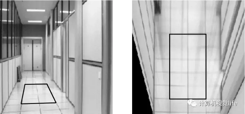 单应矩阵用于视角变换的例子如下图所示,可以方便地将左边普通视图转换为右图的鸟瞰图。