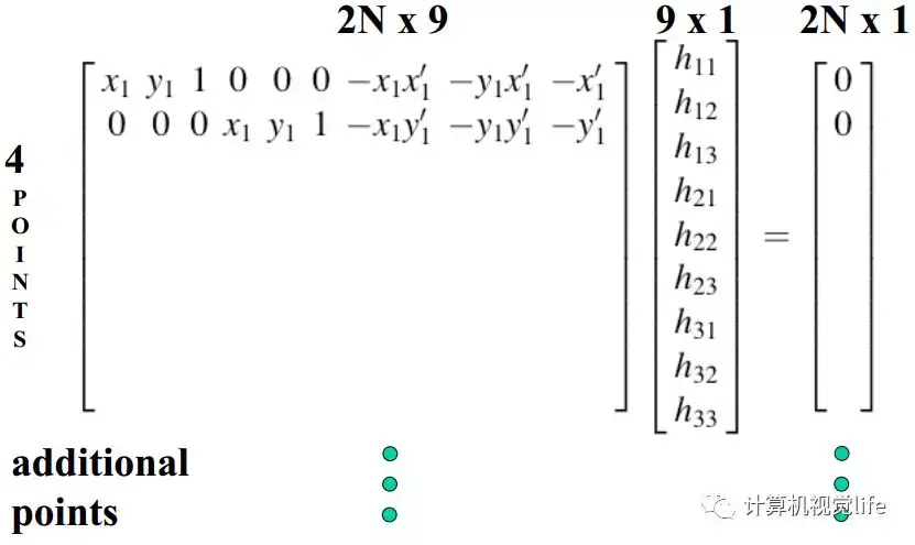 假如我们得到了两幅图片中对应的N个点对(特征点匹配对),那么可以得到如下线性方程组: