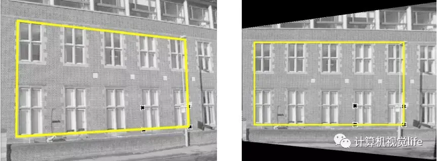 用单应矩阵进行图像矫正的例子如下图所示,最少需要四个对应点对(后面会给出原因)就可以实现。