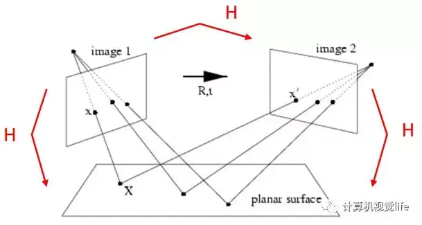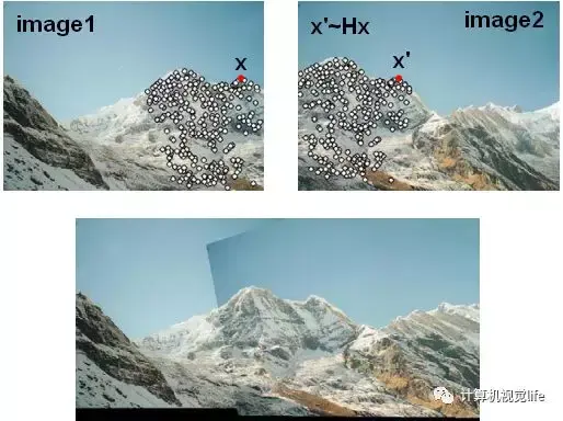 既然单应矩阵可以进行视角转换,那我们把不同角度拍摄的图像都转换到同样的视角下,就可以实现图像拼接了。如下图所示,通过单应矩阵H可以将image1和image2都变换到同一个平面。