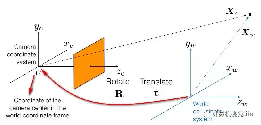 下图表示了用R,t将上述世界坐标系转换到相机坐标系的过程。