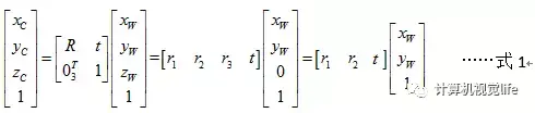 其中,R为旋转矩阵,t为平移向量,因为假定在世界坐标系中物点所在平面过世界坐标系原点且与Zw轴垂直(也即棋盘平面与Xw-Yw平面重合,目的在于方便后续计算),所以zw=0,可直接转换成式1的形式。其中变换矩阵