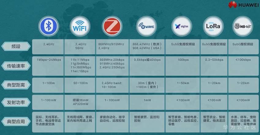 Wi-Fi UMTS/LTE Bluetooth ZigBee(短距低速) GSM LPWA(长距低速)