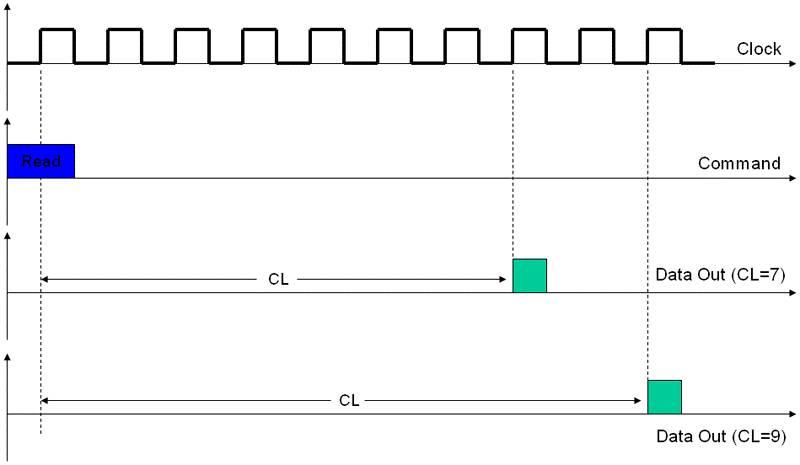 1. CL: CAS Latency。CL是指CAS发出之后,仍要经过一定的时间才能有数据输出,从CAS与读取命令发出到第一笔数据输出的这段时间,被定义为CL(CAS Latency,CAS时延)。由于CL只在读取时出现,所以CL又被称为读取时延(RL,Read Latency)。也就是我们上面第3步读取时需要的时间。CL是延迟里面最重要的参数,有时会单独在内存标签上标出如CLx。它告诉我们多少个时钟周期后我们才能拿到数据,CL7的内存会延迟7个周期才能给我们数据,CL9的则要等9个。所以越小我们越能更快的拿到数据。注意这里的周期是真正的周期而不是标注的DDR3 1333MHz的周期,因为一个周期传输两次,真正的周期只是1/2,这里是666MHz。如下图,是CL7和CL9的例子:
