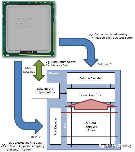 3. 数据读出或写入。根据COMMAND进行读取或者写入。在选定好小方格后,就已经确定了具体的存储单元,剩下的事情就是数据通过数据I/O通道(DQ)输出到内存总线上了。
