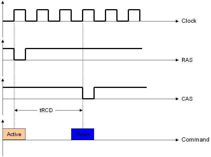 2. tRCD:RAS到CAS时延。在发送列读写命令时必须要与行有效命令有一个间隔,这是根据芯片存储阵列电子元件响应时间所制定的延迟。即步骤1和2要间隔的时间。这个间隔当然也是越快越好了,下面是个tRCD=3的例子: