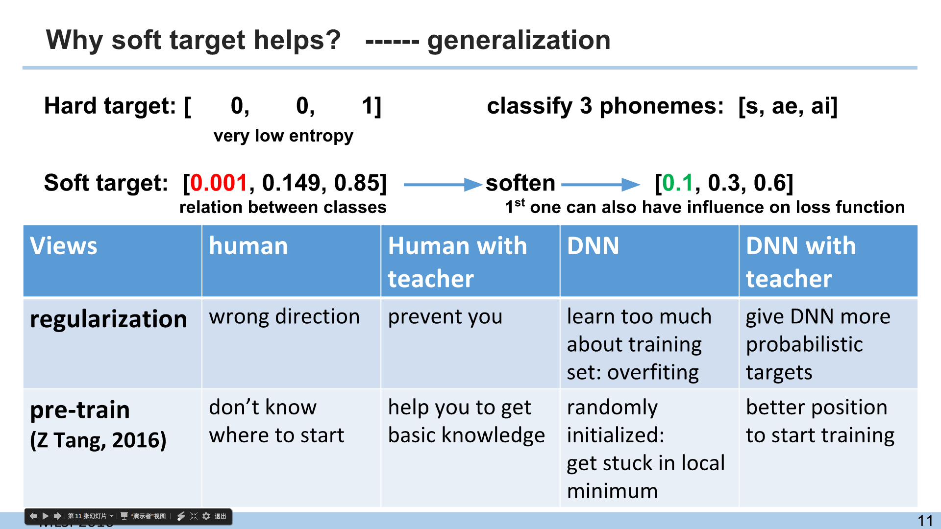 由于我发过基于generalized distillation的application论文(Articulatory and spectrum features integration using generalized distillation framework),这里先给一个我用过的ppt的一页。(ppt其中提到的论文是Recurrent Neural Network Training with Dark Knowledge Transfer)