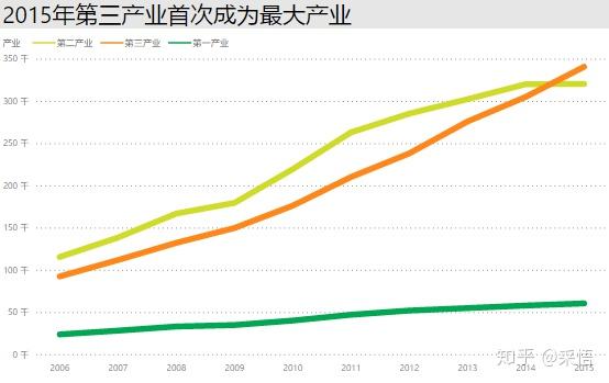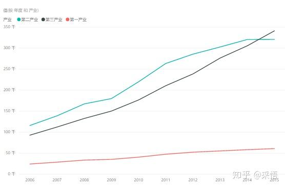 多条折线实际上多了一个维度,该维度下的每个分类代表一条折线,比如我们把字段[产业]考虑进来,拖入到【轴】下方的【图例】中,三个产业的折线图就出来了,