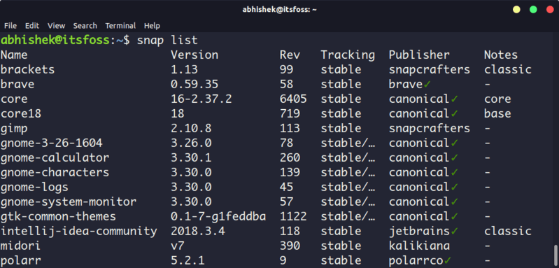 列出系统里 Snap 已安装软件包: