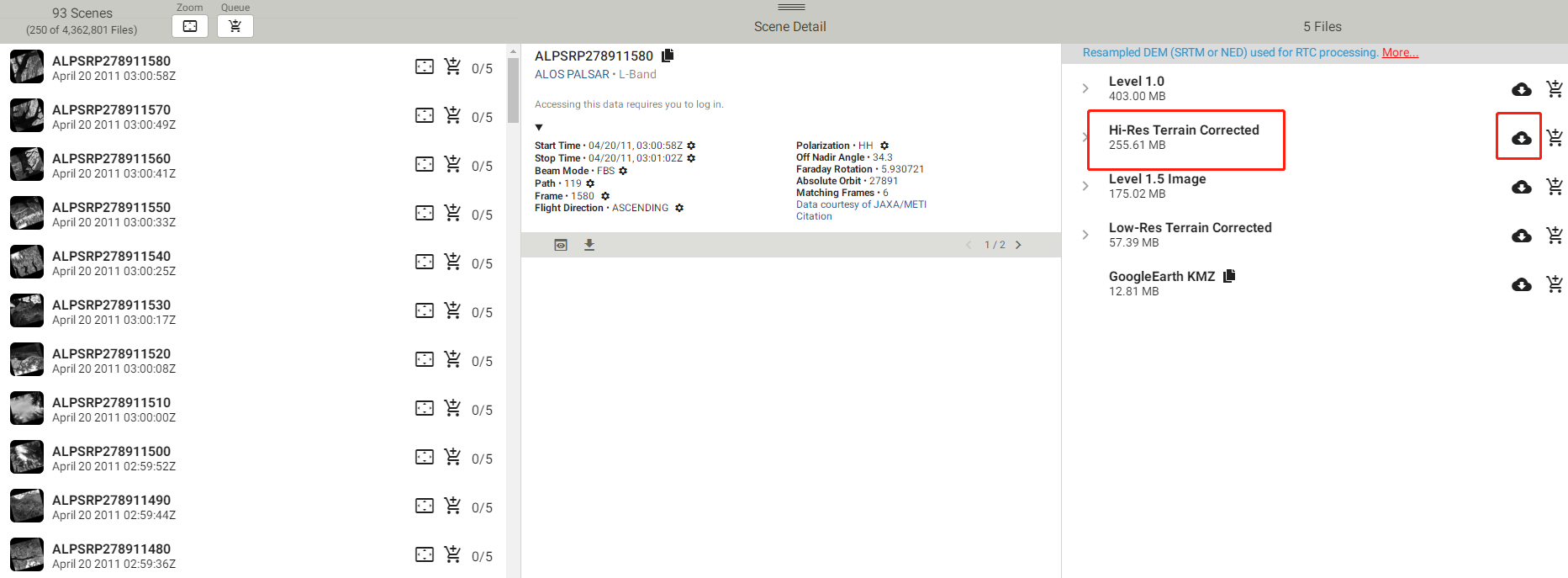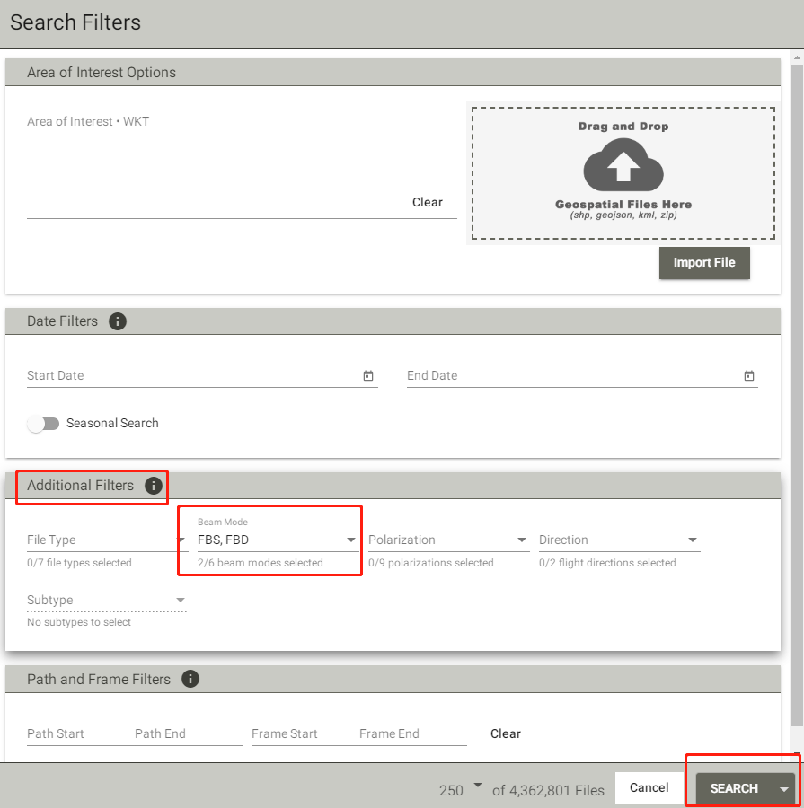 在Beam Mode中选择 FBS 、FBD(或File Type中直接选择Hi-Res Terrian Corrected这里不做演示)