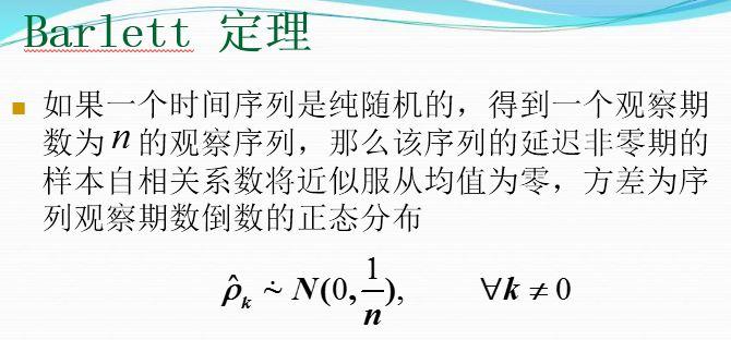 这里要用到下面的Barlett定理,可以先看一下 三.判断数据是否是白噪声 的那张图,由于p服从N[0,1/n]的正态分布,故我们可以考虑算出其95%的置信区间。