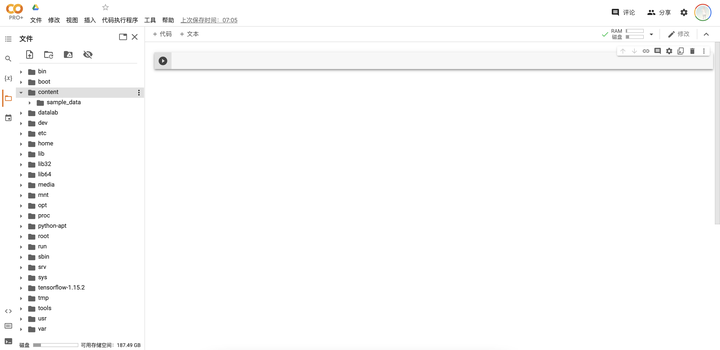 有限的实例空间:实例空间的内存和磁盘都是有限制的,如果模型训练的过程中超过了内存或磁盘的限制,那么程序运行就会中断并报错。实例空间内的文件保存不是永久的,当代码执行程序被断开时,实例空间内的所有资源都会被释放(我们在"/content"目录下上传的文件也会全部消失)。