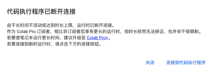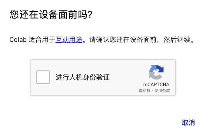 频繁的互动检测:当一段时间没有检测到活动时,Colab就会进行互动检测,如果长时间不点击人机身份验证,代码执行程序就会断开。此外,如果频繁地执行“断开-连接”代码执行程序,也会出现人机身份验证。
