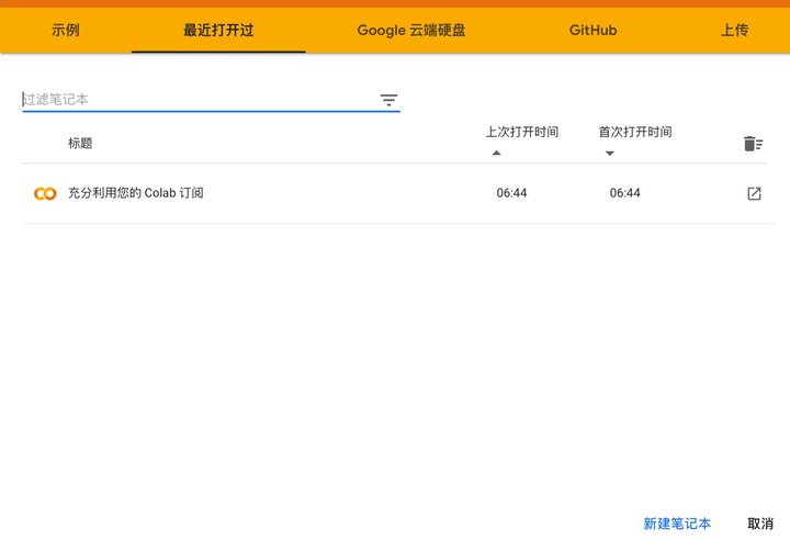 可以打开云端硬盘中的已经存在的笔记本,还可以从Github中导入笔记本。如果关联了Github账户,可以选择一个账户中的Project,如果其中有ipynb文件就可以在Colab中打开。注意:关联Github不是把Github中的项目文件夹加载到实例空间!