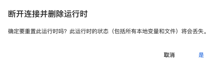 如果希望主动断开代码执行程序,则点击代码运行程序后选择“断开连接并删除运行时”即可。
