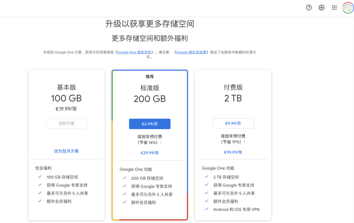 Colab一般配合Google Drive使用(下文会提到这一点)。因此如有必要,我建议拓展谷歌云端硬盘的储存空间,个人认为性价比较高的是基本版或标准版。在购买完额外的空间后,头像外部会出现一个四色光环,就像作者一样。