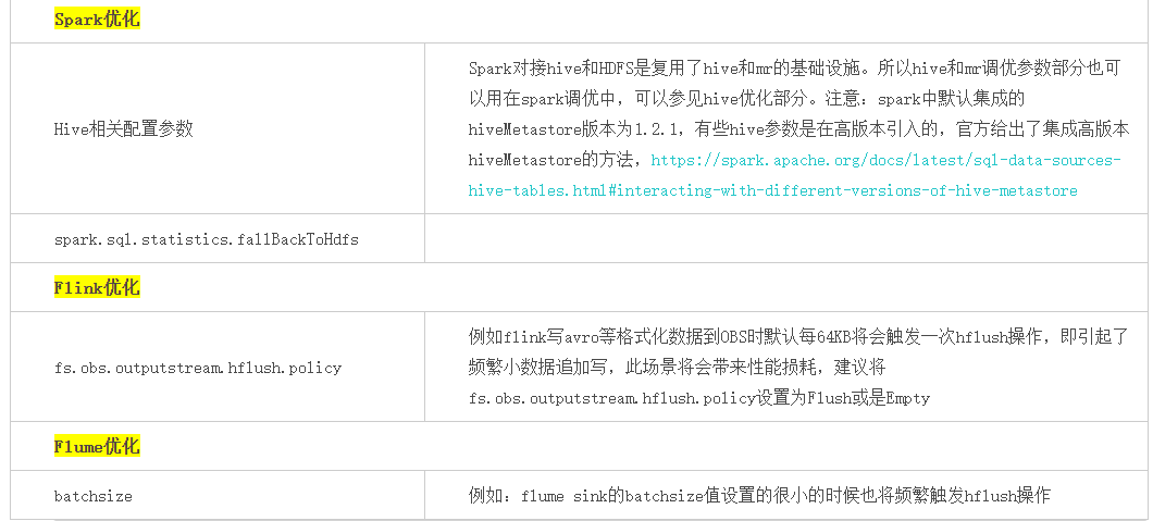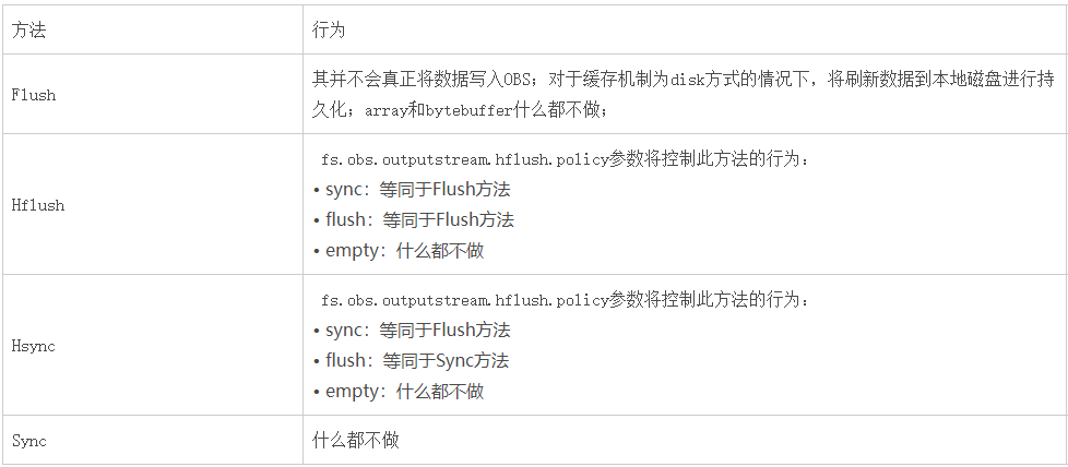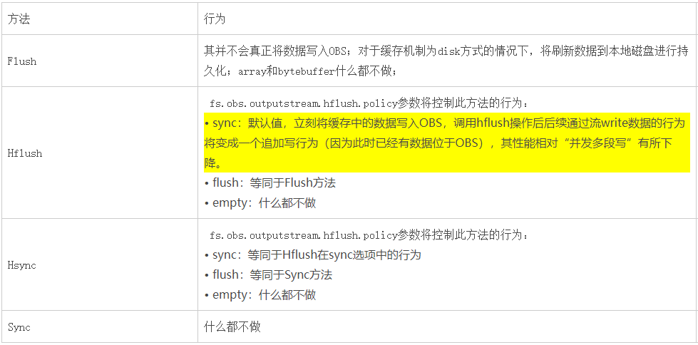 注意:hadoop-obs 46版本才开始支持fs.obs.outputstream.hflush.policy策略,之前的版本实现机制等同于fs.obs.outputstream.hflush.policy=Sync的行为。