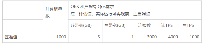 商用时需要搭建120个计算节点,OBS的读带宽=200Gb/8*(120/10)=300GB; OBS的读带宽=15Gb/8*(120/10)=22.5GB;