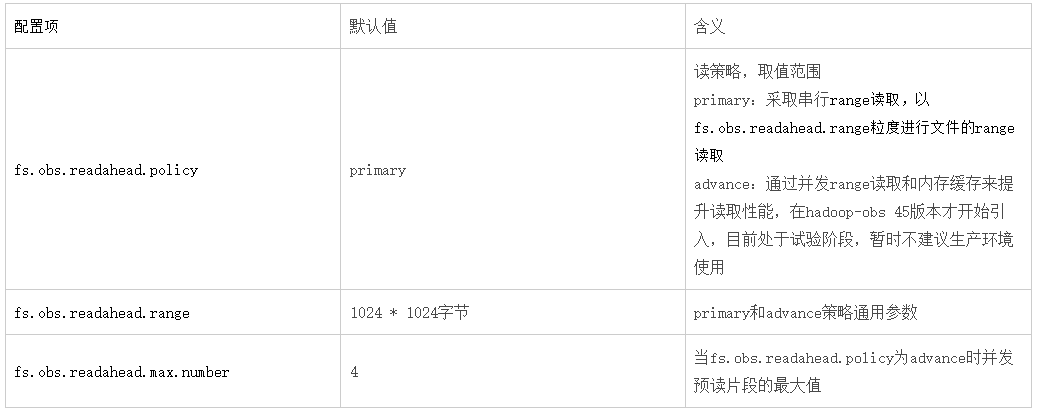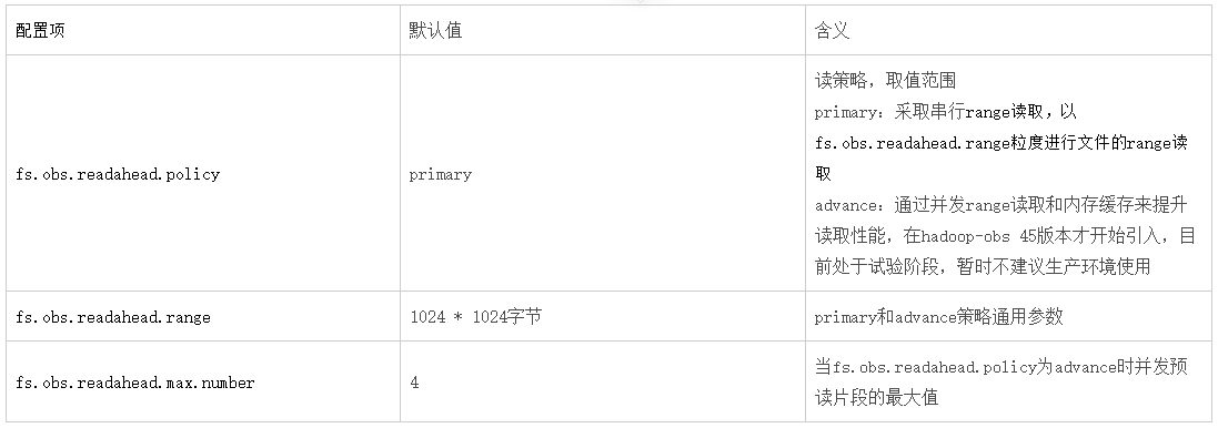 - 在advance策略下:可以适度提高fs.obs.readahead.range和fs.obs.readahead.max.number的值或是保持默认值不变