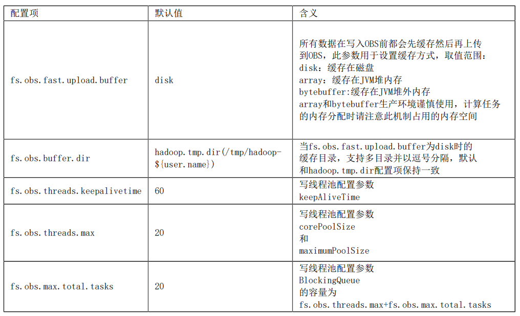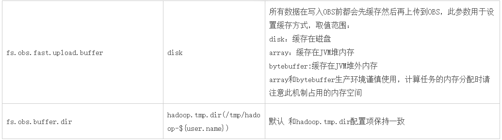 (2)当缓存fs.obs.fast.upload.buffer设置为array或bytebuffer时,生产环境谨慎使用,计算任务的内存分配时请注意此机制占用的内存空间