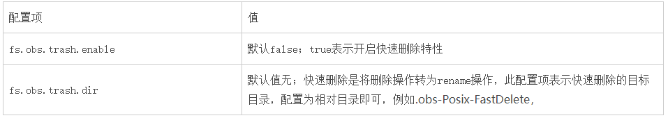 注:快速删除开启后需要配合OBS服务的生命周期特性,定期删除fs.obs.trash.dir目录中的数据