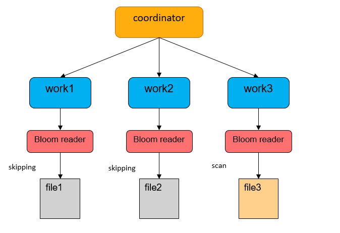 对于 BloomFilter、Bitmap 就完全不一样了,测试结果表明 1.4T 数据产生了 1G 多的 BloomFilter 索引,把这些索引加载到 Coordinator 显然不现实。我们知道 Hudi MDT 的 BloomFilter 实际是存在 HFile里,HFile点查十分高效,因此我们将 DataSkipping 下压到 Worker 端,每个 Task 点查 HFile 查出自己的 BloomFilter 信息做过滤。