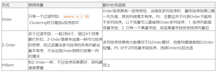 - Clustering中各种排序方式需要结合 Column statistics 才能达到更好的效果。
