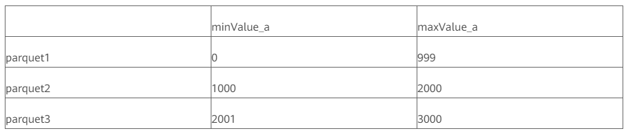 当我们完成数据布局后,对每个文件的相关列收集统计信息,下图给个简单的示例,数据经过排序后写入表中生成三个文件,指定点查 where a < 10 下图可以清楚的看出 a < 10的结果集只存在于 parquet1文件中,parquet2/parquet3 中 a 的最小值都比10大,显然不可能存在结果集,所以直接裁剪掉 parquet2和 parquet3即可。