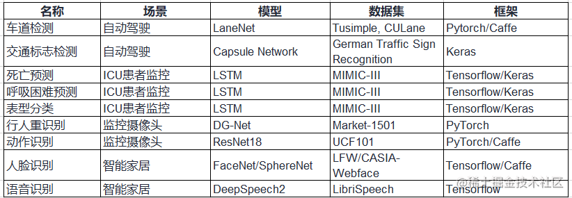 Edge AI Bench涵盖的场景、模型、数据集情况如下表所示。
