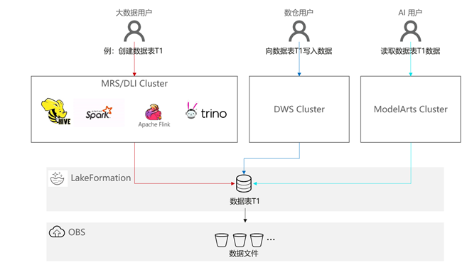 以数智融合场景为例,当大数据用户在MRS中创建了表T1时, 数仓用户可通过lakeformation观察到表T1的元数据,并通过DWS写入正确的数据内容。