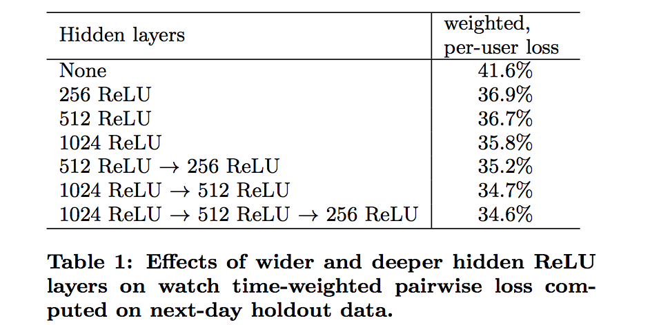 下图的table1是离线利用hold-out一天数据在不同NN网络结构下的结果。如果用户对模型预估高分的反而没有观看,我们认为是预测错误的观看时长。weighted, per-user loss就是预测错误观看时长占总观看时长的比例。