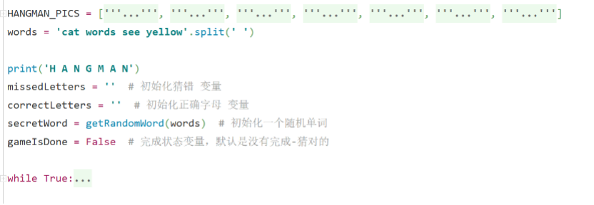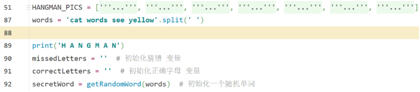 这时候就运用到了程序世界里的第一种流程-顺序执行。先创建"HANGMAN_PICS"变量,而后是"words"。