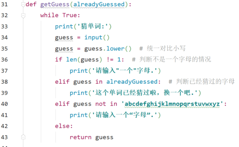 但是现实问题总是有很多分叉选项,以猜单词为例。需要用到分支控制(if…else)来屏蔽掉输入多个字母/非字母的情况,来保证程序不会因为错误的输入不知所措