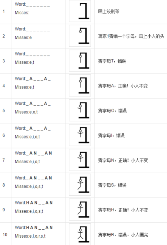 想字的玩家一般会画一个绞刑架,当猜字的玩家猜出了短语中存在的一个字母时,想字的玩家就将这个字母存在的所有位置都填上。