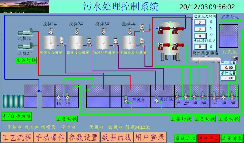 提升泵1、2开启PAC计量泵、PAM计量泵开启,气浮机的多相流泵,刮渣机开启。