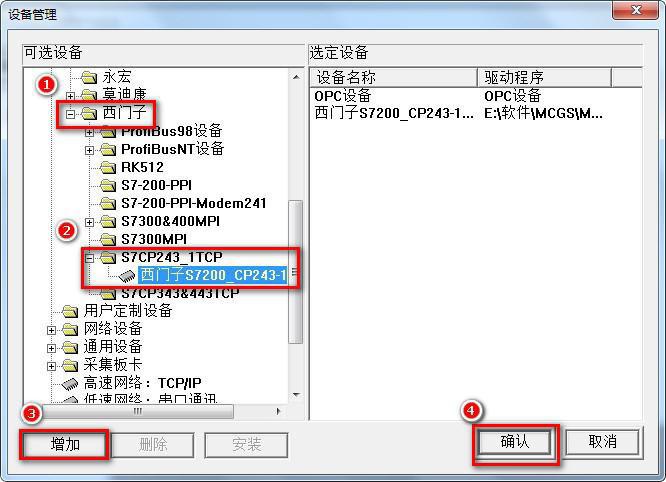 1、打开昆仑通态 MCGS 组态环境——设备窗口,选择【PLC-西门子-S7CP243_1TCP】;