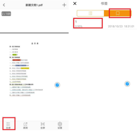 之后通过点击屏幕下方的“目录”,并切换到“书签”后就可以看到我们之前新建的书签,点击即可快速跳转到对应的页面内容。