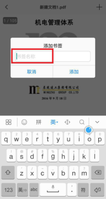 在弹出的窗口中输入当前书签的名称后点击确定,这页的书签就做好了。
