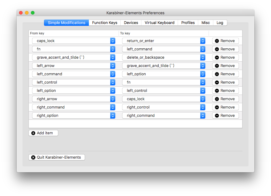 打开Karabiner-Elements,点击Add item即可添加一条键位规则。From key是物理按键,to key是你想映射的键。