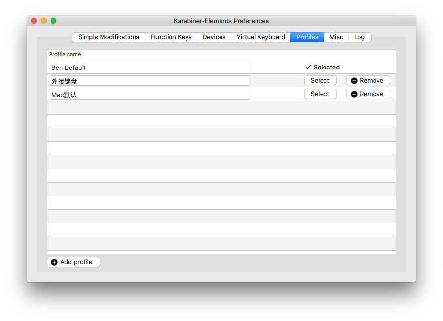 另外,一般键盘和Mac的键盘布局不一样,强行把配置套用过来可能很别扭,用Profile切换也很方便。