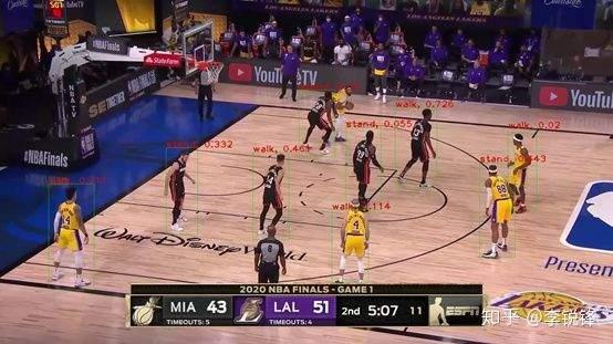 想必大家对篮球运动都比较熟悉,在看球赛时,通过我们的肉眼看到的画面,对赛场情况进行观察,可以分析出一些有用的信息。现在随着AI技术的迅速发展,通过深度学习算法也可以对篮球赛场上的画面进行学习,然后对篮球运动员的数量、行为等提取一些有用的信息,比如:通过对球员衣服颜**分出各篮球队的成员,也可以通过对球员的行为分析出球员正在执行什么动作以及赛场的比分等,如图1所示为通过ModelArts平台完成推理后展示的球员信息。