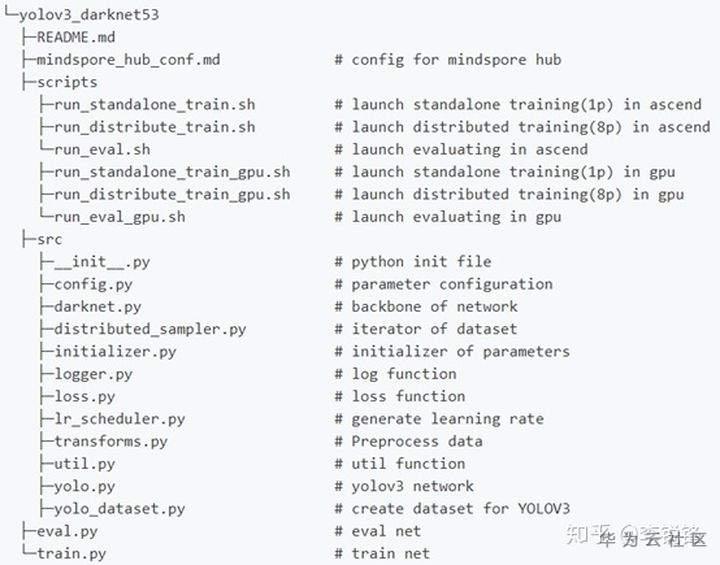 3) src目录下主要是训练脚本和推理脚本需要调用的一些模块,如:yolo.py文件中主要的yolov3_darknet53网络结构脚本、yolo_dataset.py文件是模型读取并处理数据的脚本等。