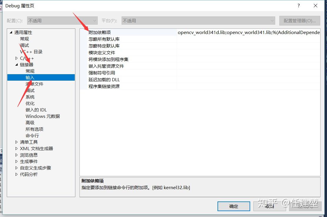 同样是在属性页面中配置,链接器->输入->附加依赖项